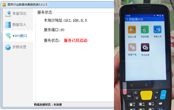 1、基础配置:在电脑端安装“药监通”客户端,PDA端预装同名APP。通过WiFi将设备与电脑连接至同一局域网,在APP“系统设置”中输入电脑IP地址完成配对。