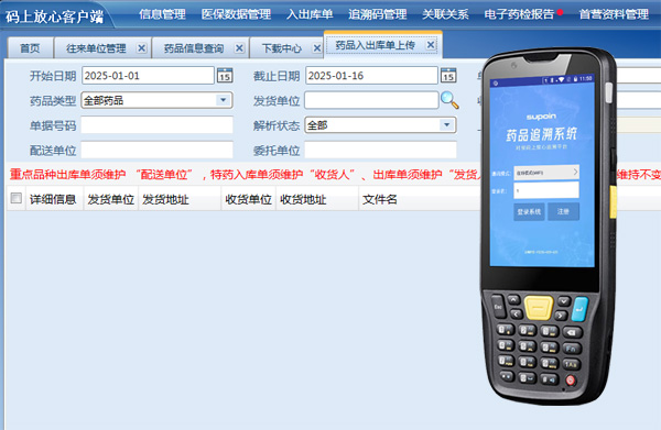 在配置好扫码枪与电脑对接后,操作员扫码后的数据,通过WiFi或数据线,会先传至电脑端的D:\SFDA\InData文件夹中,打开“码上放心客户端”软件,在“入出库单”》“药品入出库单上传”栏目,可查询到扫码枪传过来的数据。此刻的数据还并未上传至“码上放心”平台,需勾选单据,点击“上传”按钮,才会真正上传到“码上放心”平台,而这时会出现各种无法上传的失败提示,下面就由专注追溯码扫描枪的销邦汇信为大家一一介绍解决方法。